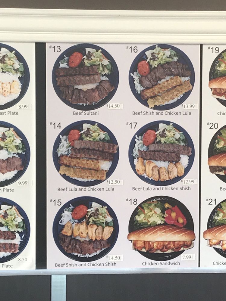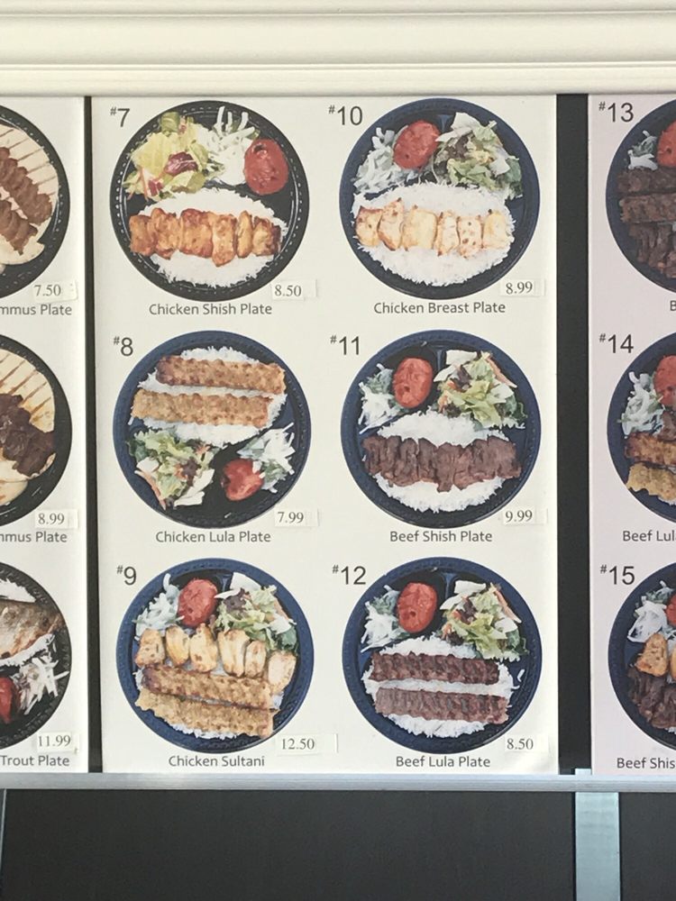 Served with rice, salad, broiled tomato, sliced onions and pita bread.