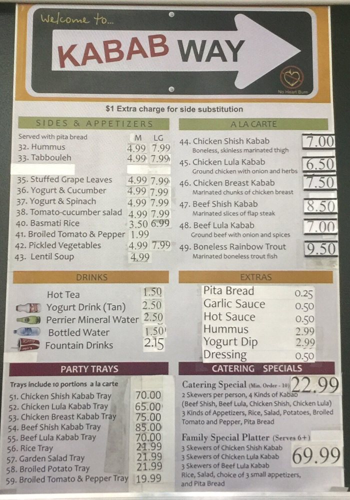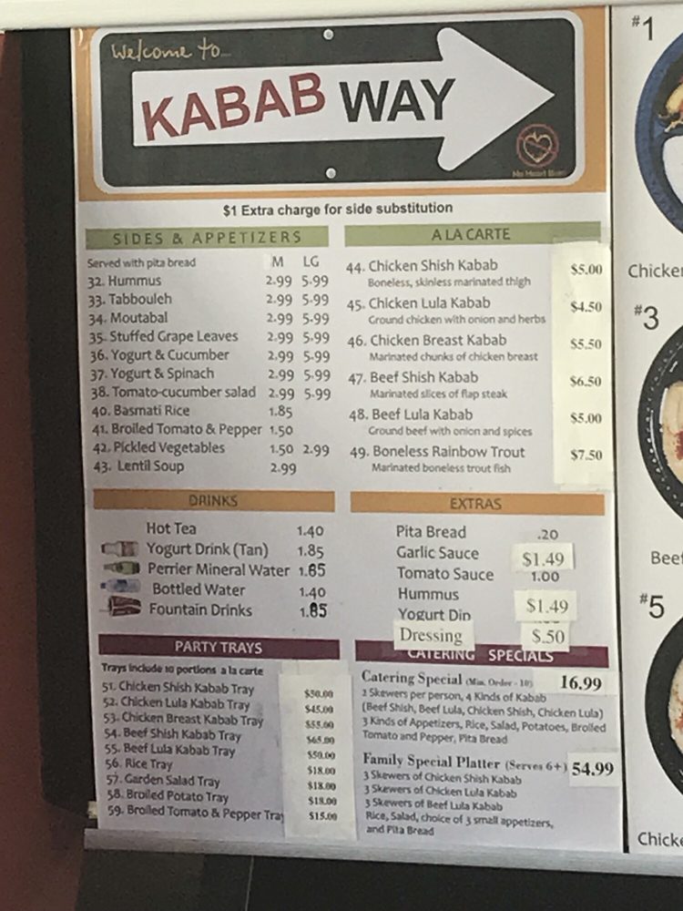 Welcome to Kabab Way, a delightful Middle Eastern restaurant located in Glendale, CA. Their menu is a vibrant celebration of flavors, featuring an array of dishes that cater to both meat lovers and vegetarians alike. Start your journey with appetizers like creamy hummus, stuffed grape leaves, or the refreshing tabbouleh, all priced affordably at $3.99. For those seeking a heartier meal, try the chicken shish kabob salad, a harmonious blend of marinated chicken, mixed greens, and traditional Mediterranean sides for $14.99.
